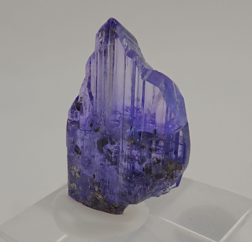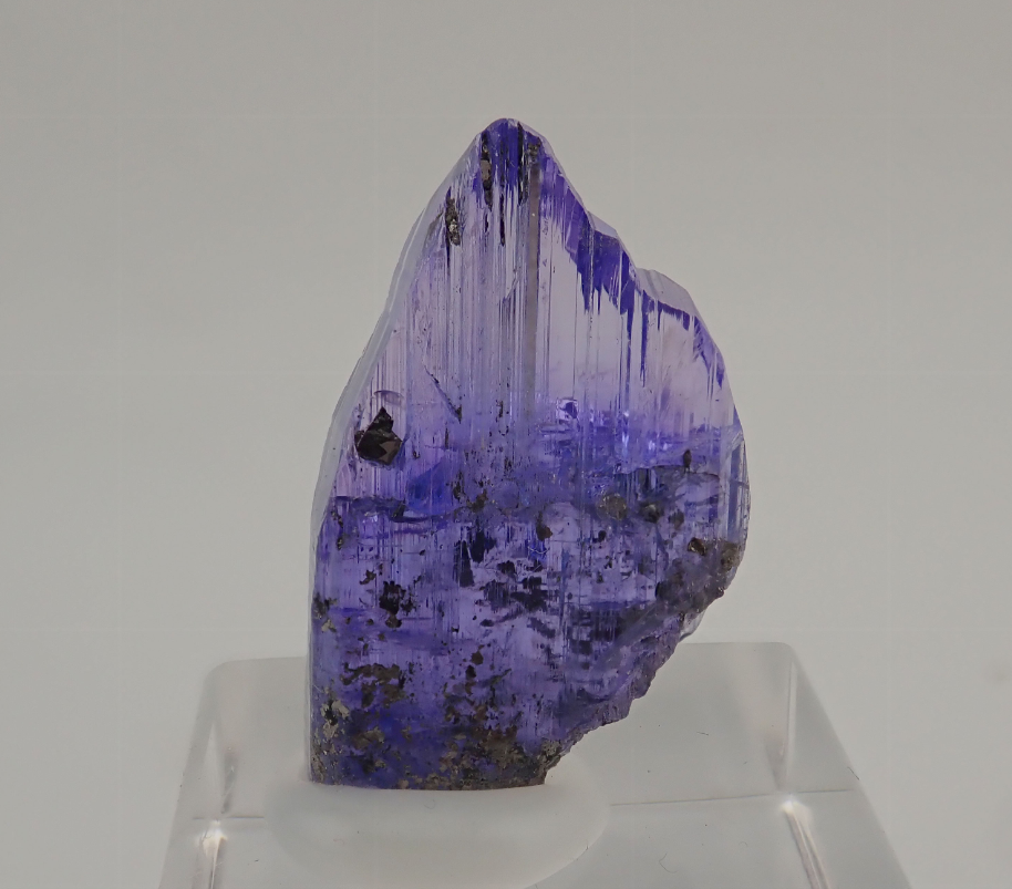 Single gemmy crystal of Zoisite, Tanzanite variety, with very well defined faces, edges and crystalline forms, and with perfect terminal faces. The crystal is transparent, very bright and with a very intense, deep and uniform lavender blue color. The condition is excellent, no damage. Accompanied by Graphite.
